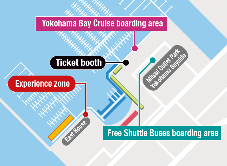 ◎Boarding and disembarking locations at Yokohama Bayside Marina will be at the rear of bus station(Mitsui Outlet Park Yokohama).