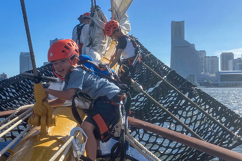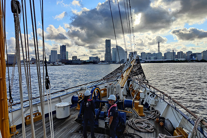 ベイブリッジを超え横浜港内を周遊。航海中セイルを皆で広げた後は、バウスプリット渡りや、操舵体験、海洋環境調査体験等に参加いただきます。