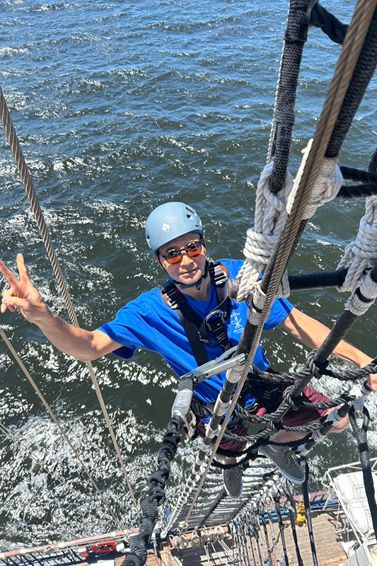 船首方向に長く伸びた帆船特有の設備であるバウスプリットの渡し網を渡り、船の先端で風を感じていただけます。